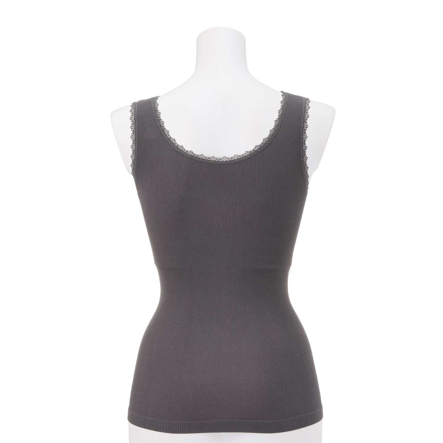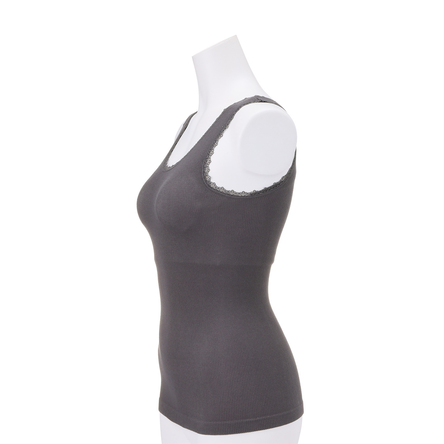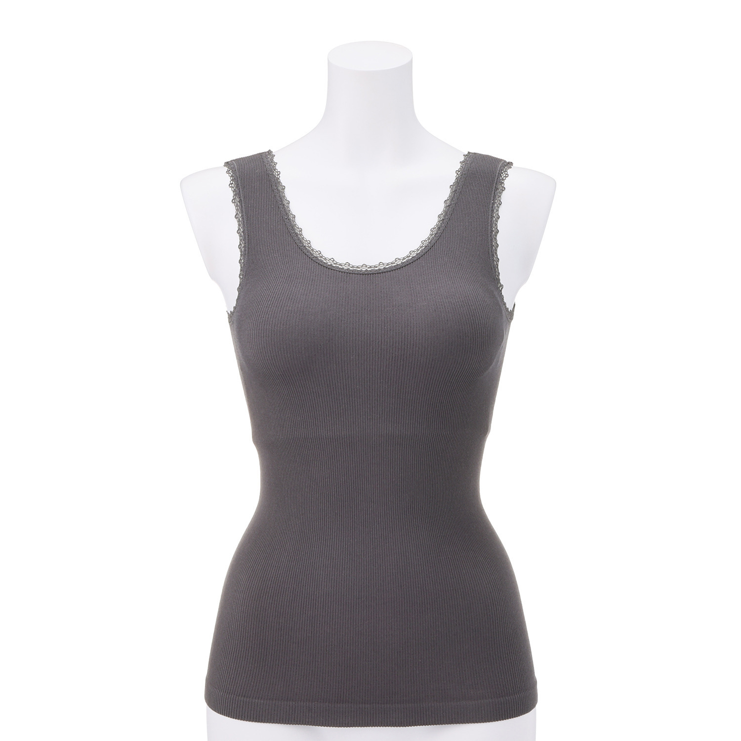 細巾レースをあしらってフェミニンで大人可愛いテイストに仕上げた取り外しカップ付きタンクトップ。